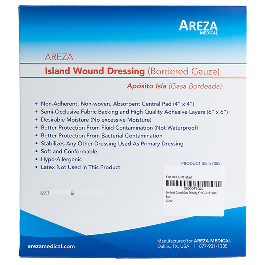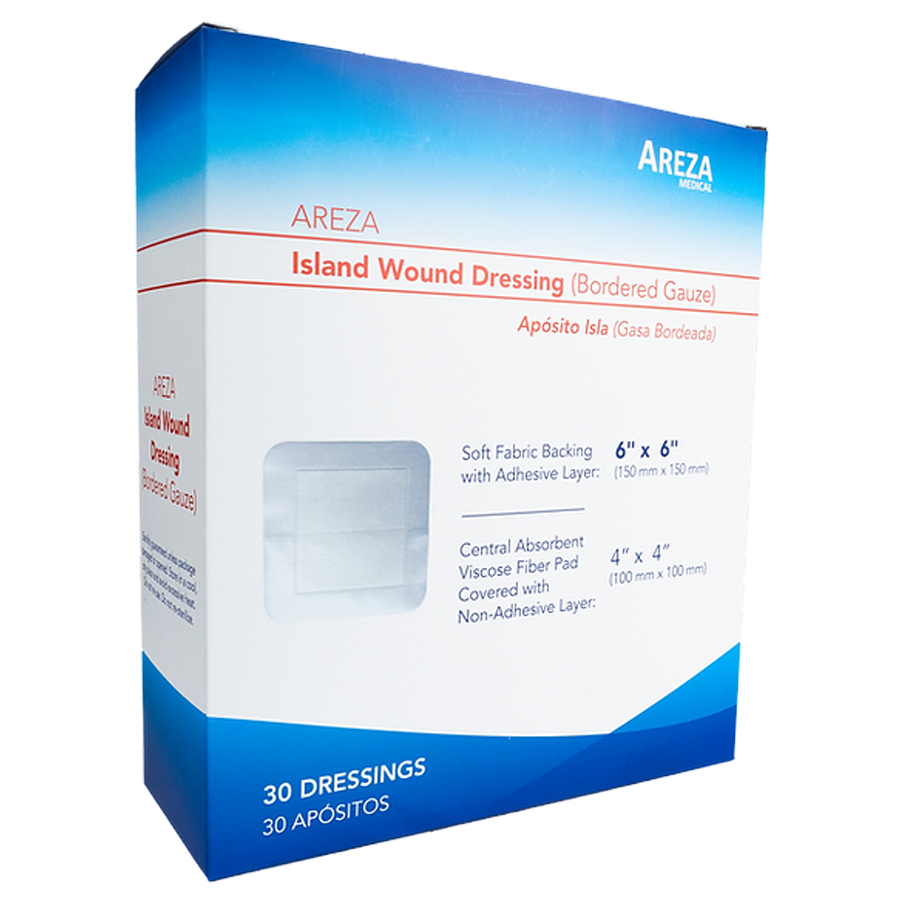 • El apósito para heridas Areza Island (gasa con borde) es un apósito estéril indicado para heridas quirúrgicas y no quirúrgicas. Algunos ejemplos de heridas incluyen: úlceras por presión, heridas vasculares mixtas, úlceras en las piernas,